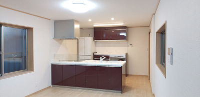 造作壁を取り払い、より開放感のあるキッチンになりました。ボルドーのキッチンをアクセントとした和モダンな空間にしました。