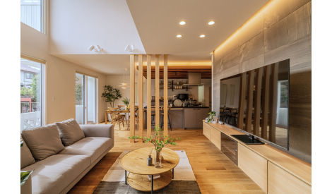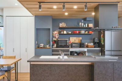 奥様がLDK全体を見渡せるアイランドキッチン。食事の準備や家事もしやすい、便利な配置を実現しました。