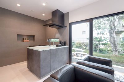 ブロンズグリーンの愛車が映えるモダンな空間。キッチンからは四季折々の庭の様子も眺めることができます。