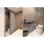 色味と風合いにこだわったトイレの便ふたとオリジナルの真鍮を使ったドアがラグジュアリー感を演出。