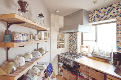 カラフルなタイルで彩り、明るく楽しい雰囲気のキッチンに。背面には使い勝手のよいオープンスタイルの食器棚を設置しました。