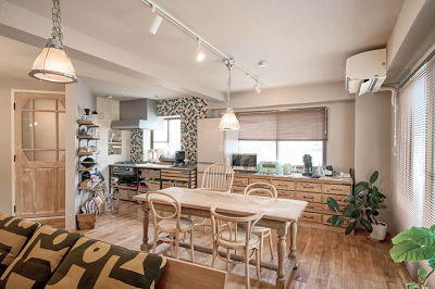 K様ご自身で足を運び、選び抜いた古材やヴィンテージ建具をひとつずつ丁寧に調整して取り付け、味わいあるLDKを実現。ご不便を感じていた水廻りの動線はレイアウトを見直し使いやすく。集中収納できるウォークインクローゼットを新設し、たくさんお持ちのファッションアイテムもスッキリ納まります。「毎日、家に帰るのが楽しみになりました」と大好評です。
