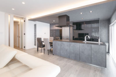 設備の老朽化をきっかけに「シンプル&ミニマム」をテーマにリフォームされたT様ご夫婦。モダンでトーンを抑えたインテリアをセレクトしたLDKは、ラグジュアリーホテルのラウンジのよう。徹底した収納計画によって表に出る“モノ”を減らし、生活感をミニマムに。見せない工夫を詰め込んで、居心地のよい暮らしを実現しました。