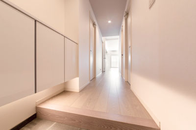 玄関からLDKにつながる廊下は、天井を組み直して天井高を確保。通路の幅も広げ、間接照明を設置することでイメージも一新。