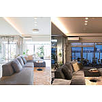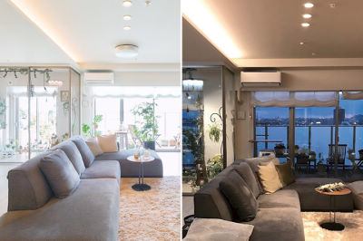 緑と自然光がたっぷりで明るい昼間と、夜景も美しいリビングは、集光型のダウンライトと天井の間接照明を合わせて、ラグジュアリー感を演出。