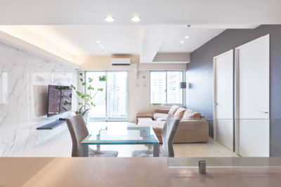 海と空を身近に感じるスタイリッシュなLDK。ベイビューと陽の光を楽しむことができます。