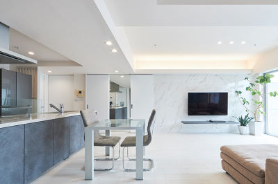 お子様ふたりの個室を設けるのを機に、眺望のよさを活かして全面リフォーム。日当たりがよく、海の見える側にLDKを配置。キッチンは対面式のオープンタイプにして明るさと開放感をプラス。個室へはリビングを必ず通ってから入室するように間取りを決め、家族のコミュニケーションに配慮。随所に収納を設けて、スッキリ片付くスタイリッシュな空間に仕上げました。