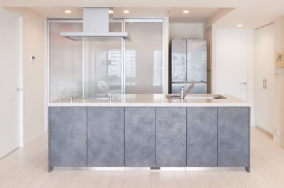 背面の半透明扉の収納とカウンター下の収納でスッキリ片付くキッチン。景色を見ながら、お子様と一緒にお菓子作りも楽しめます。