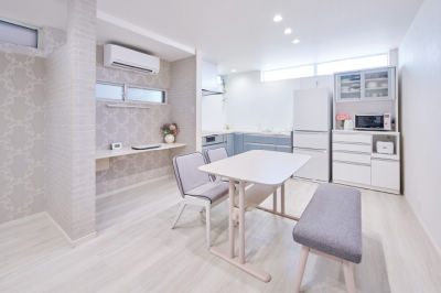 ご両親と二世帯同居をしているM様。生活リズムの違いを気にせず暮らせるよう、ガレージの一部をM様世帯用のダイニングキッチンにしました。扉柄や壁紙にこだわり、シンプルかつ高級感のある空間に。また、通りから視線が入らないよう高窓を採用。リフォームすることでM様もご両親もお互いに心地よい距離感で過ごせる住まいになりました。