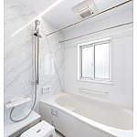 天井のフラットラインLED照明により、スタイリッシュな雰囲気に。浴槽と水栓はスゴピカ素材でお手入れもラクだそう。