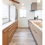 料理好きのN様ご一家。通路を広めに確保したので家族一緒に料理ができます。キッチン扉は天井梁と調和する木目調に。