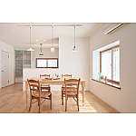 ワンルームのLDKにして室内は明るく開放的に。床材は既存建具とマッチする木目の濃淡がリズミカルな床材を採用。