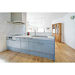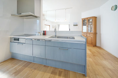 ゆったり調理を楽しめる奥様お気に入りのブルーグレーの対面キッチン。食器洗い乾燥機とお手入れが楽なレンジフードで家事の負担も軽減。