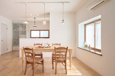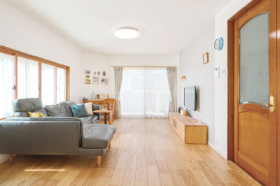 ご自宅で営む英語教室の環境をよくしたいと、中古住宅を購入してリフォーム。教室は、和室をフローリングの洋室に変更。かわいいブルーの壁やポップな色あいの床を選び、楽しく集中できる空間に。住居部分はひと続きの現代的LDKにアップデート。さらに断熱性と耐震性も向上させ、住まいと教室の両方の居心地を高めた住まいが完成しました。