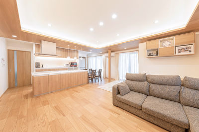 折り上げ天井で開放感を高めたLDK。オープンスタイルのキッチンは、作業していてもお子様の様子にしっかり目が届きます。