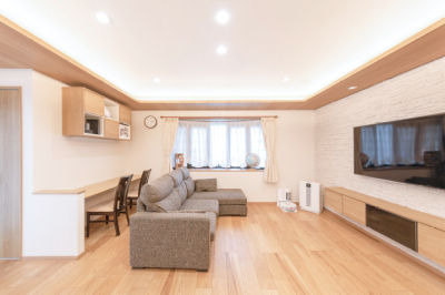 天井をぐるりと囲む折り上げ天井と間接照明のおかげで、空間全体が明るく開放的に!子どもも毎日元気に遊び、家族の笑い声が絶えない家になりました。親子での楽しい記憶を、この家に刻んでいけたらいいですね。