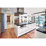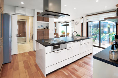 お孫さんたちとわいわい集いたいと、2階のダイニングをバルコニー側に広げ、キッチンは開放感あるアイランドキッチンに。バルコニーにはウッドデッキと木製格子を設け、LDKが屋外までつながるような広がりを演出しています。デッキからの光と風、美しい植栽が心を潤わせてくれる、癒しの住まいになりました。