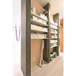 テレビを設置した壁の裏側に、書類や小物を収納できる棚を造作したことで、リビングをすっきり保てます。