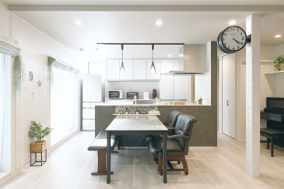 ご実家の2階をリフォームし、新生活をスタートしたS様。専用の玄関、家族4人が自然に集まる広いLDK、十分な収納をご希望でした。玄関は1階に新設し、2階の生活空間はモノトーンでコーディネイトした大空間LDKに一新。アイランドキッチンを採用して、料理しながら家族団らんが楽しめる住まいとなりました。