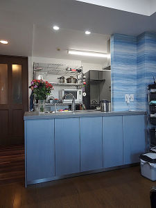 袖壁の撤去によりキッチン幅が変更になり、床もリフォームすることになり、USUI-TA[ウスイータ]を提案し、既存の床と一体化することができました。
