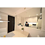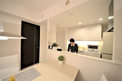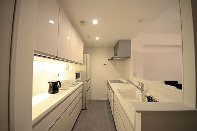 キッチンとカップボードはホワイトで統一。間接照明が一気に雰囲気を強調してくれます。