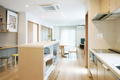 ゆったりしたキッチンスペースは、みんなで調理しても窮屈にならない広々サイズ。年中快適に過ごせる床暖房や空調設備も万全。