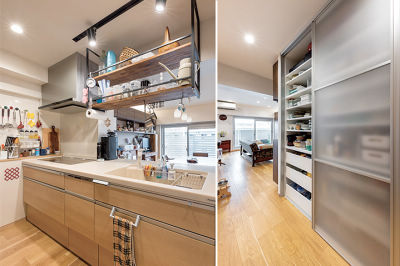 リビング・ダイニングを見渡せる対面式キッチン。廊下側に大型のカップボードを設置して野菜などを保管できるパントリーのように有効活用。