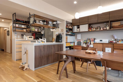 リビング・ダイニングを見渡せる対面式キッチン。廊下側に大型のカップボードを設置して野菜などを保管できるパントリーのように有効活用。