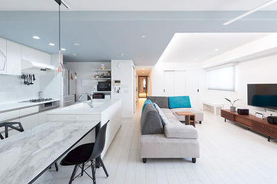 リビングに隣接していた和室も取り込んで広く開放的なLDKに。白を基調にして明るく、洗練された空間に生まれ変わりました。