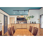 ふたりでも動きやすいスペースを確保。木目、ブルー、グレーの配色とペンダントライトがカフェのような印象に。