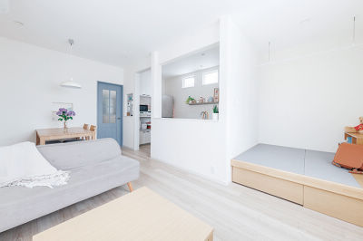 ホワイトのクロスをベースにして、明るく清楚なLDKを演出。ブルーの内装ドアや畳コーナーをアクセントにし、空間を引き締めます。残す必要がある壁や柱を利用した、セミクローズドキッチン。開口部を大きくし、リビングとのつながりを意識。