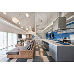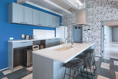 お孫様がのびのび遊べる、大空間の明るいLDK。白とブルーを基調にしたインテリアは海と好相性で、リゾートハウスのような趣きです。