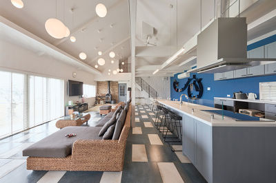 お孫様がのびのび遊べる、大空間の明るいLDK。白とブルーを基調にしたインテリアは海と好相性で、リゾートハウスのような趣きです。