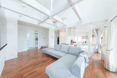 ご夫婦好みのカリフォルニアテイストを取り入れ、LDKと水廻り・廊下をつなげて吹き抜けのある大空間へと一新。