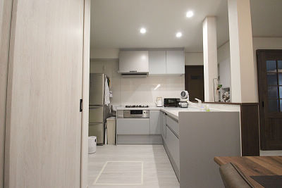 以前も対面のキッチンでしたが、窓の方を向いていたり吊り戸があったりと閉鎖感がありました。L型のキッチンを設置したことにより、片側を対面にすることができリビング・ダイニングを見渡せることができます。