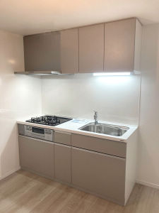 2口コンロ設置可のキッチン、換気扇、開き戸タイプの収納
