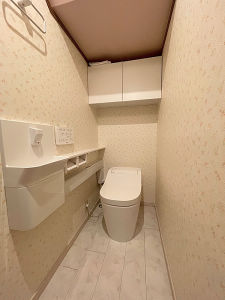 毎日、お掃除していても「汚れ」「埃」は何時でも目に飛び込んできます。いつも清潔感のある空間をアラウーノが実現しました。1F、2Fそれぞれのレストルームがお客様のお好みのクロスで、明るい空間に仕上がりました。