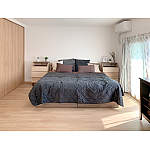 シンメトリーにベッドとサイドボードを配置ベリティスと家具の色を合わせて暖かみがあるけどスッキリとした印象の寝室に窓から光と風が気持ちよく入ります。