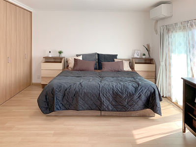シンメトリーにベッドとサイドボードを配置ベリティスと家具の色を合わせて暖かみがあるけどスッキリとした印象の寝室に窓から光と風が気持ちよく入ります。