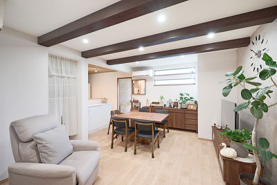構造上見えてしまう梁を化粧し、デザインとして活かすことに。横長の高所窓はからの光が優しくリビングダイニングを照らします。洋室への扉は壁面に溶け込むグレーにし、自然とアクセントウォールに馴染むように。LDとKの間は梁で仕切って天井材を貼り分けているのがポイントです。