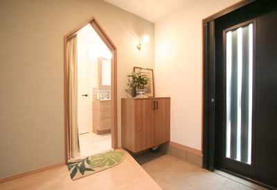 ホールは高齢のお母様を介助しながら、歩くことができるように広さを確保。玄関収納コンポリアを設置。