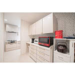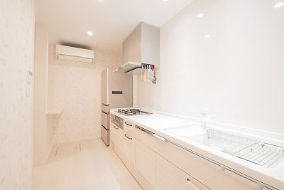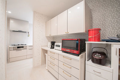 吊戸棚も高さを下げて配置し、使いやすいスペースに。