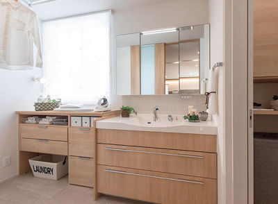 キッチンからつながる洗面室。室内干しスペースと収納を備え、「洗う・干す・たたむ・仕舞う」を1か所で完結できる家事動線を実現。