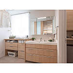 キッチンからつながる洗面室。室内干しスペースと収納を備え、「洗う・干す・たたむ・仕舞う」を1か所で完結できる家事動線を実現。