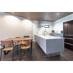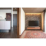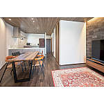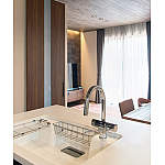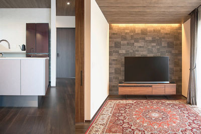 明るいオープンキッチンの横に天井高いっぱいのドアを設置。間接照明の効果も相まって、広がりを感じられるLDKになりました。
