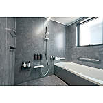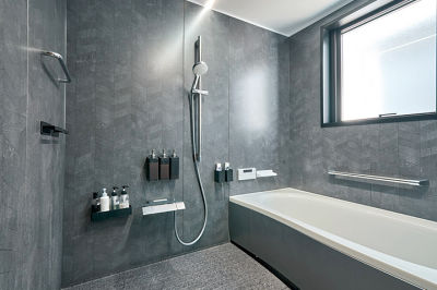 高級感が漂い、ゆっくりとくつろげる浴室。ヘリンボーンブラックの壁柄で、スタイリッシュな雰囲気に。
