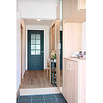 大容量の収納で玄関すっきり。ネイビー色の室内ドアは採光タイプで、空間を広く感じさせます。