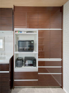 キッチン横に設けた天井いっぱいのカップボード。調理家電もすっきり収納でき、使い勝手も上々です。