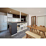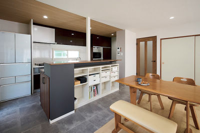 キッチンとリビングの間にカウンターを設置し、下に日用品用の収納を設けました。明るく開放的なLDKになり、家族の様子を見ながら調理することができます。