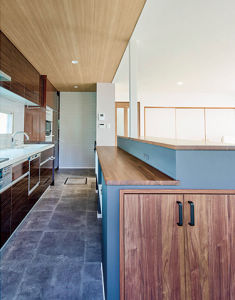 キッチン側の天井は、木目柄のクロスを使用。石目調の床材を合わせて、リビングとは雰囲気の異なる空間に。